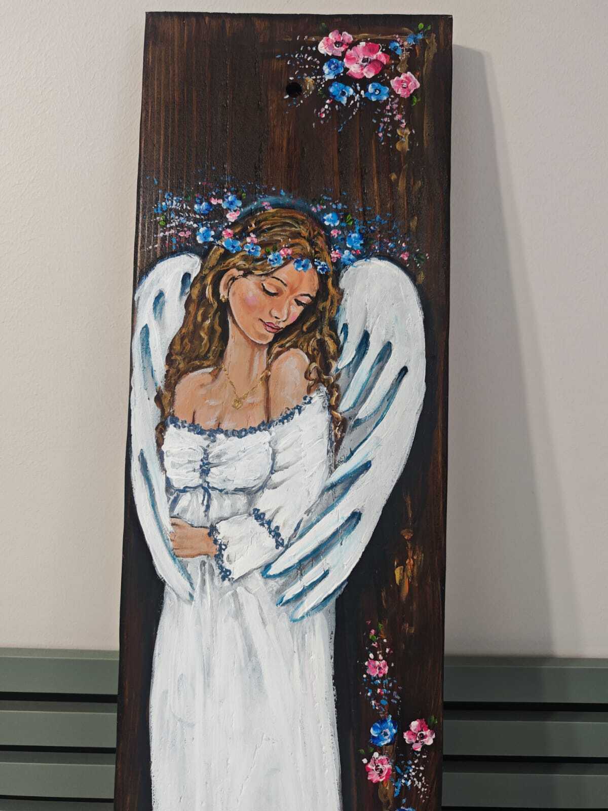 Ręcznie malowany anioł na desce - kwiaty łąki