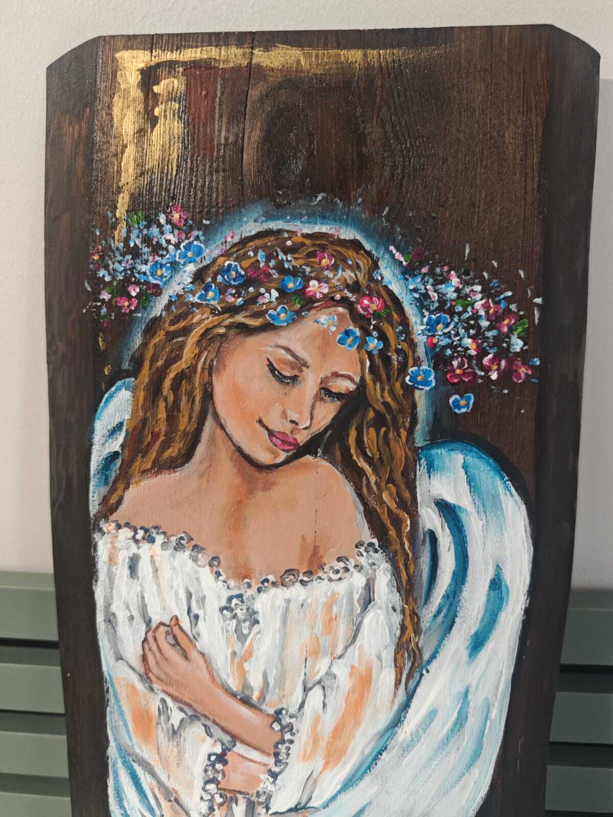 Ręcznie malowany anioł na drewnie z wiankiem na głowie