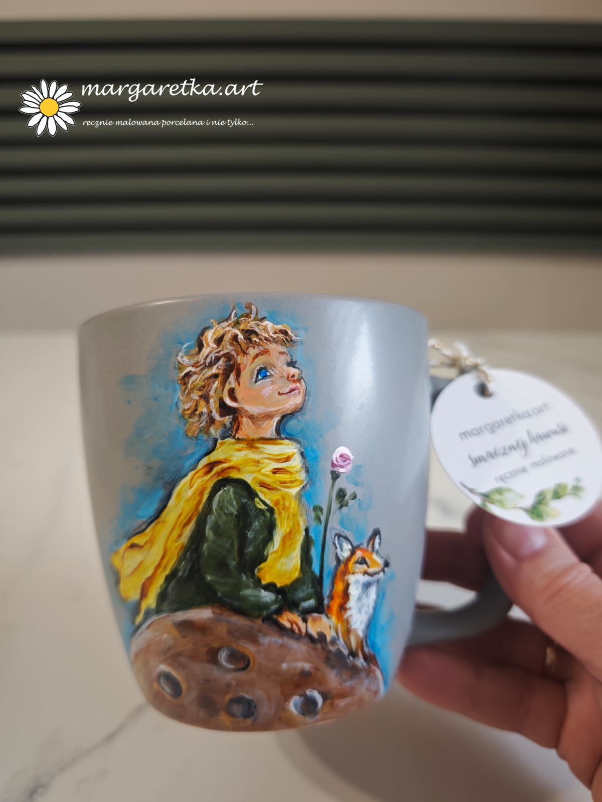 Ręcznie malowany kubek inspirowany kultową postacią Małego Księcia to idealna propozycja dla miłośników literatury i pięknych, unikalnych przedmiotów. Ozdobiony starannie dobranym cytatem, przywołuje wyjątkowy klimat książki, jednocześnie umilając codzienną chwilę z ulubionym napojem. Wykonany z trwałych materiałów, jest nie tylko estetyczny, ale także praktyczny, doskonały na prezent lub jako wyjątkowy element osobistej kolekcji.