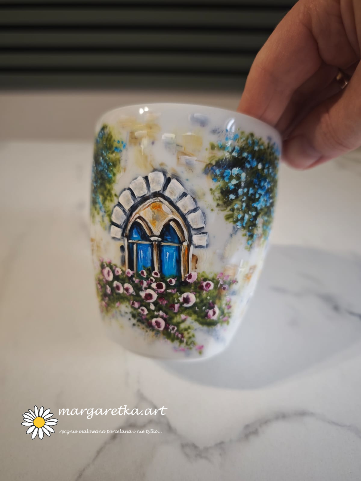 Ręcznie malowany kubek - Okienko pełne kwiatów