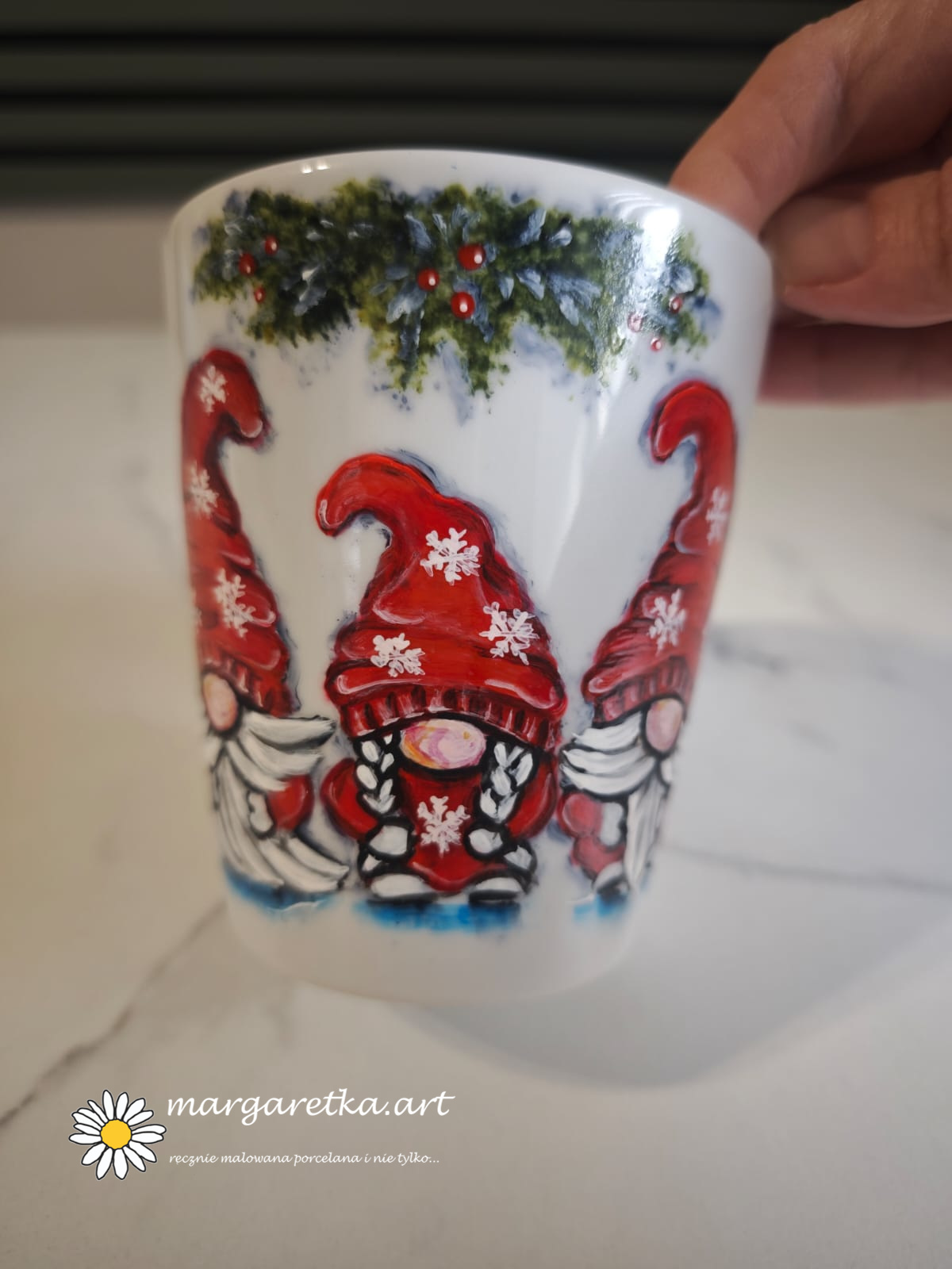 Ręcznie malowany kubek "Zimowe skrzaty" to wyjątkowy dodatek, który wprowadzi zimowy urok do Twojej kuchni. Każdy kubek jest starannie ozdobiony unikalnym wzorem przedstawiającym urocze skrzaty, co czyni go doskonałym pomysłem na prezent. Wykonany z wysokiej jakości porcelany, nadaje się do codziennego użytku, a ręczne malowanie sprawia, że każdy egzemplarz jest jedyny w swoim rodzaju.